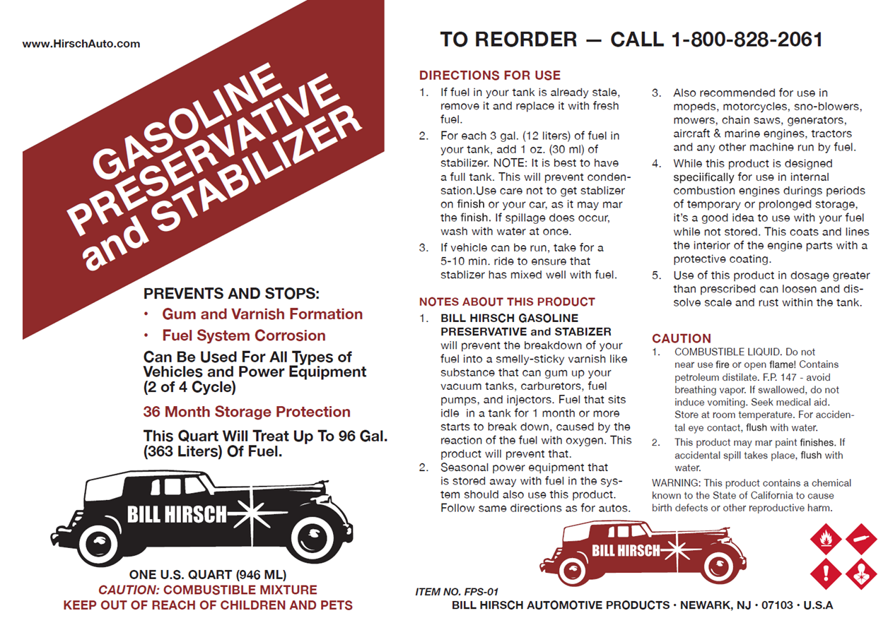 This fuel preservative prevents gum, varnish formation and corrosion in fuel tanks and fuel systems. This gas stabilizer contains no alcohol that attacks some metals.